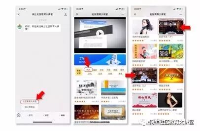 进入到公众号,点击底部菜单栏左侧【社区教育大讲堂】根据下图指引即可观看精彩课程。